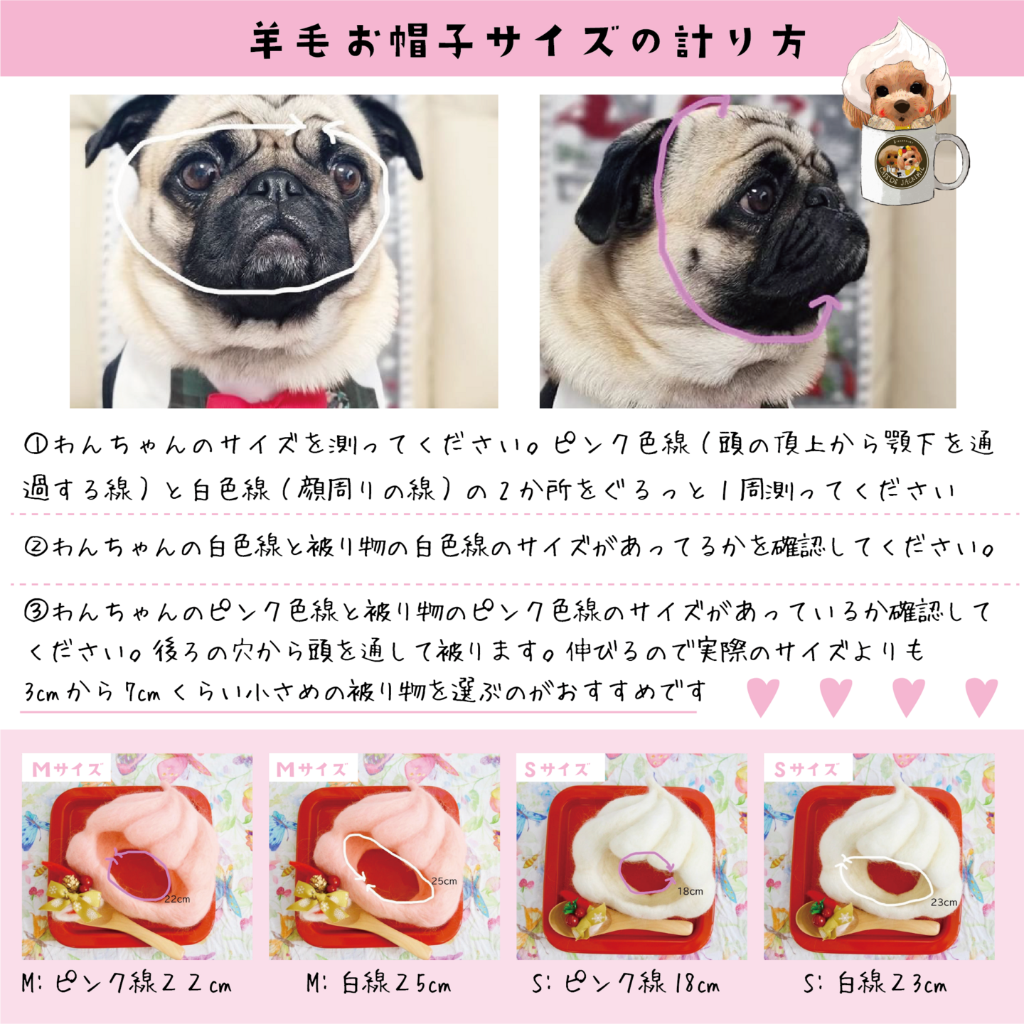 ③わんちゃんのピンク色線と被り物のピンク色線のサイズがあっているか確認してください。後ろの穴から頭を通して被ります。伸びるので実際のサイズよりも3cmから7cmくらい小さめの被り物を選ぶのがおすすめです。